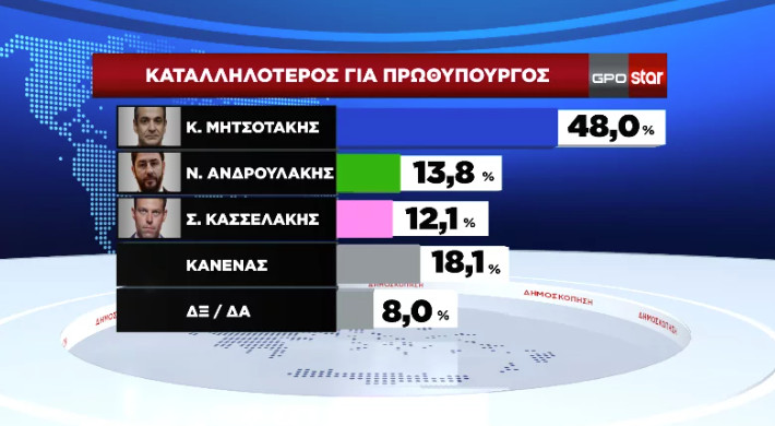 Επίσης, ο Κυριάκος Μητσοτάκης αποτελεί την καταλληλότερη επιλογή για την πρωθυπουργία, σύμφωνα με το 48% των ερωτηθέντων, έναντι 13,8% που απαντούν το ίδιο για τον Νίκο Ανδρουλάκη και 12,1% τον Στέφανο Κασσελάκη.