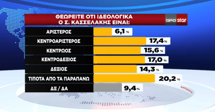Μόνο το 6,1% των πολιτών θεωρεί ότι ο Στ.Κασσελάκης ιδεολογικά είναι αριστερός. Το 17,4% απαντά κεντροαριστερός, το 15,6% κεντρώος, το 17% κεντροδεξιός και το 14,3% δεξιός ενώ 20,2% απαντά τίποτα από τα παραπάνω.