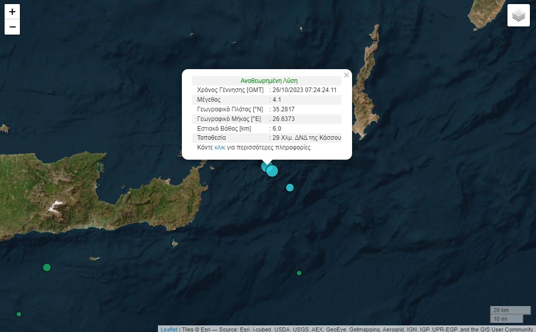 Σεισμός 4,1 Ρίχτερ σημειώθηκε το πρωί της Πέμπτης 26/10 στον θαλάσσιο χώρο ανοιχτά της Κάσου.