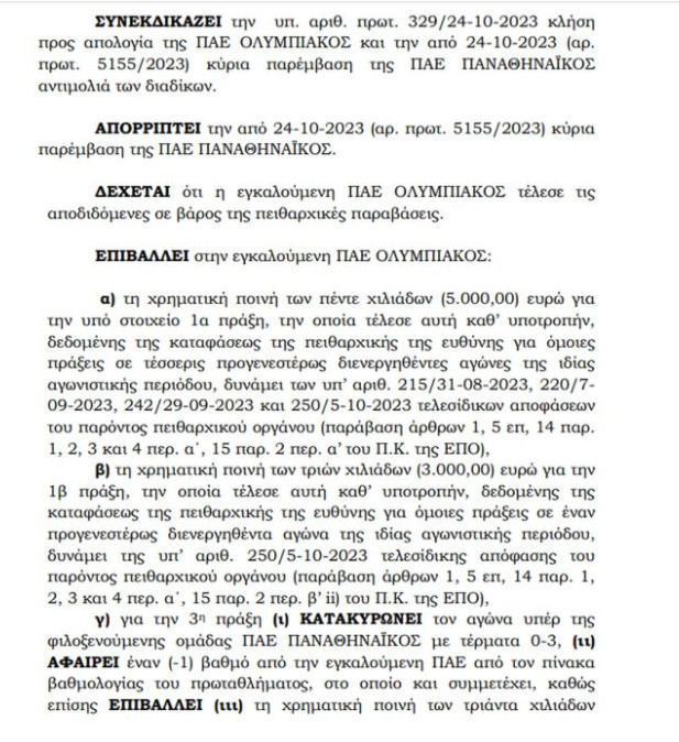 Μετά την απολογία των ερυθρόλευκων και την παρέμβαση των πράσινων, καθώς και τα συμπληρωματικά υπομνήματα που κατέθεσαν οι δύο πλευρές αποφάσισε να τιμωρήσει με -1 βαθμό τον Ολυμπιακό και να κατοχυρώσει το ματς στον Παναθηναϊκό με 0-3.
