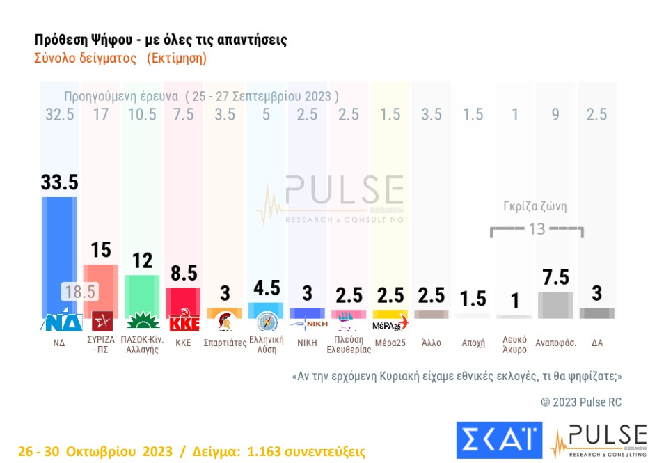 Στις 18,5 ποσοστιαίες μονάδες τοποθετείται η διαφορά της Νέας Δημοκρατίας με τον ΣΥΡΙΖΑ, σύμφωνα με νέα δημοσκόπηση της Pulse για λογαριασμό του ΣΚΑΪ.