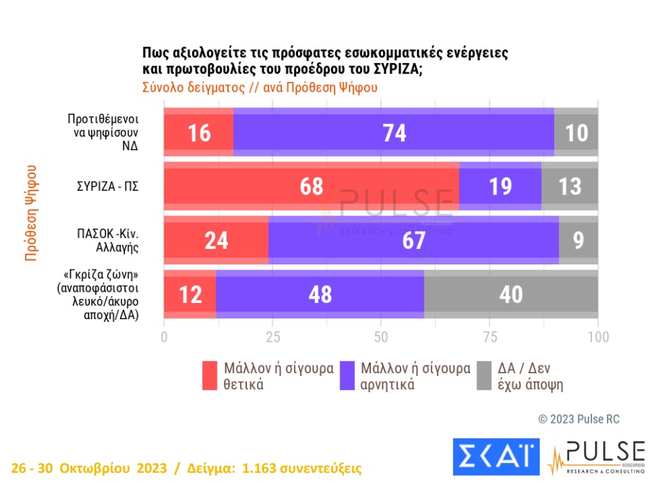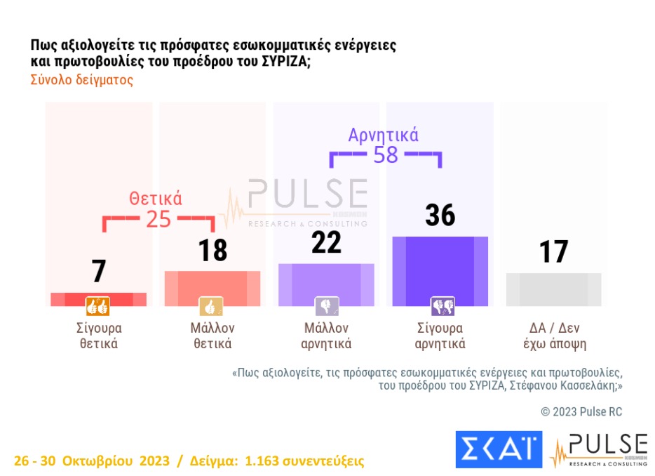 Πάντως, το 68% των ψηφοφόρων του ΣΥΡΙΖΑ «βλέπει» θετικά τις κινήσεις Κασσελάκη.