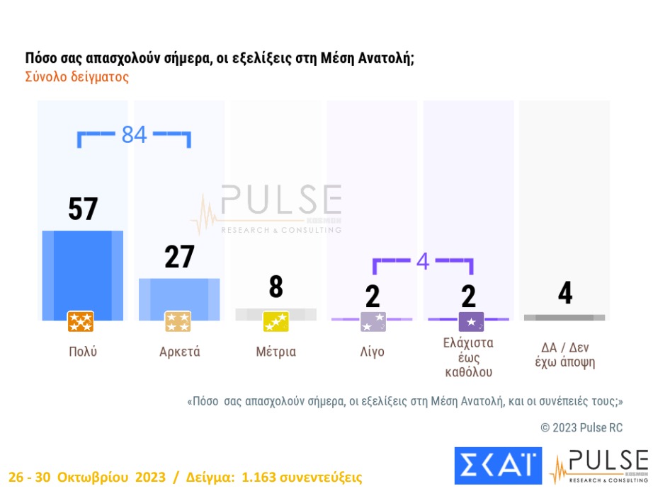 Ένα εξίσου συντριπτικό ποσοστό δηλώνει προβληματισμό για την πολεμική εμπλοκή στη Μέση Ανατολή. Ειδικότερα, το 84% να δηλώνει ότι οι εξελίξεις τους απασχολούν «πολύ» (57%) ή «αρκετά» (27%).