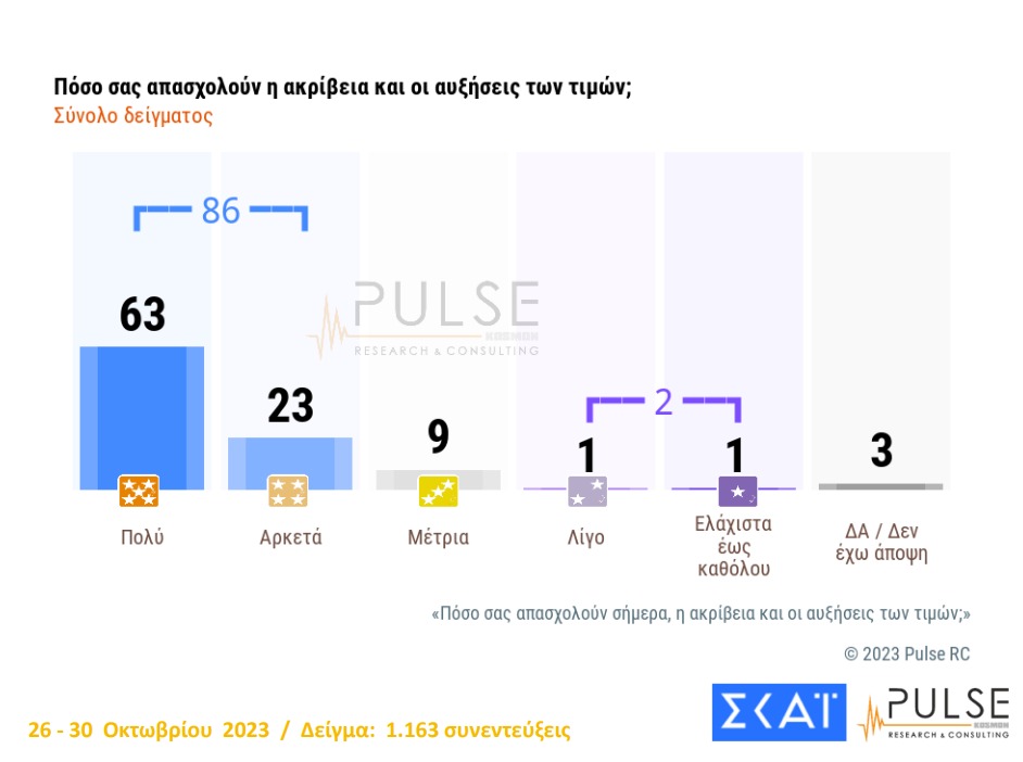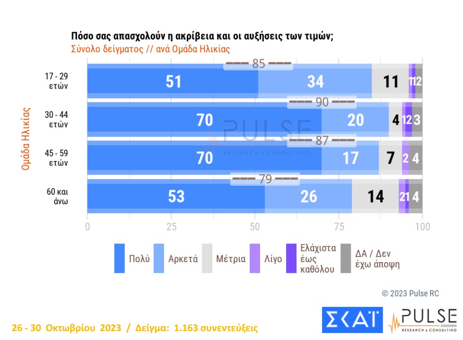 Το 86% των ερωτηθέντων δήλωσαν ότι τους απασχολεί η ακρίβεια , ενώ σχεδόν ένα στα δύο νοικοκυριά προβληματίζονται κυρίως με τις τιμές στα τρόφιμα και στους λογαριασμούς του ρεύματος. Οι ηλικίες που ανησυχούν περισσότερο είναι από 30 έως 59 ετών.