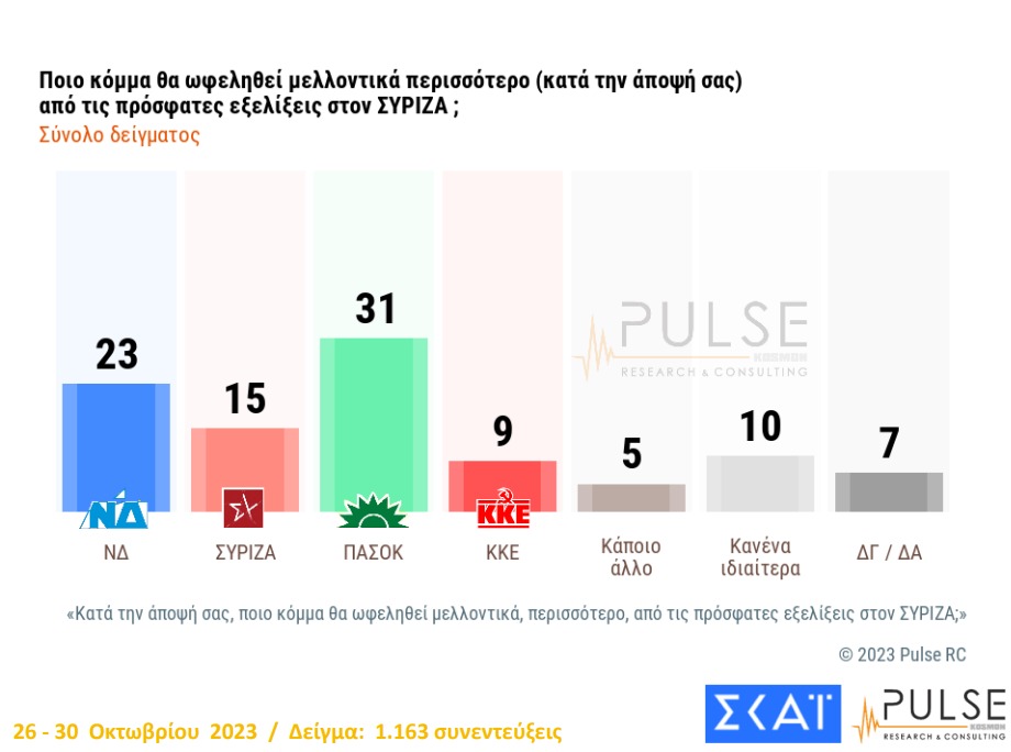 Στην ερώτηση «ποιο κόμμα θα ωφεληθεί μελλοντικά περισσότερο από τις πρόσφατες εξελίξεις στον ΣΥΡΙΖΑ», η πλειοψηφία, δηλαδή το 31% απάντησε το ΠαΣοΚ.