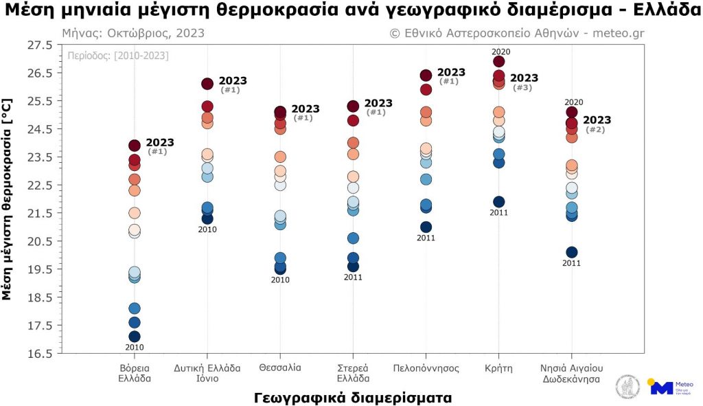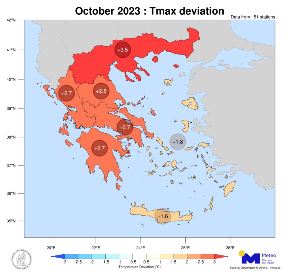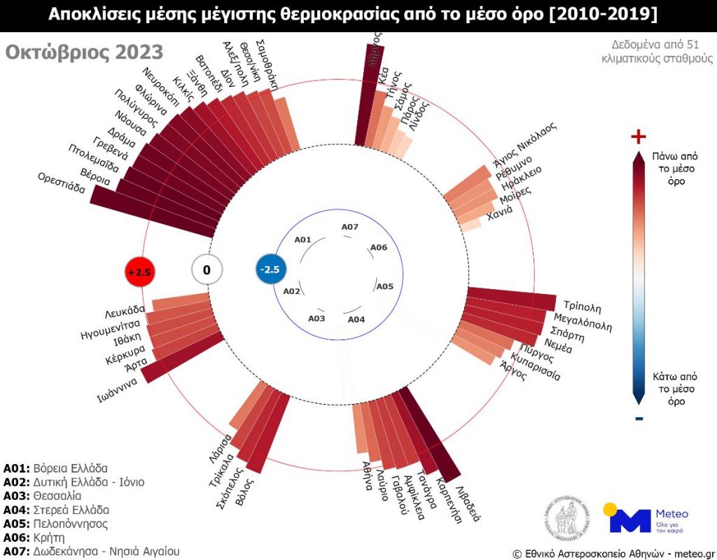 Σύμφωνα με το δίκτυο 51 μετεωρολογικών σταθμών του Εθνικού Αστεροσκοπείου Αθηνών/meteo.gr που λειτουργούν ανελλιπώς από το 2010 μέχρι σήμερα, τον φετινό Οκτώβριο η μέση τιμή των μεγίστων ημερήσιων θερμοκρασιών κυμάνθηκε σε ακραία υψηλά επίπεδα σχεδόν στο σύνολο της χώρας, σε σχέση με τον μέσο όρο της περιόδου 2010-2019.
