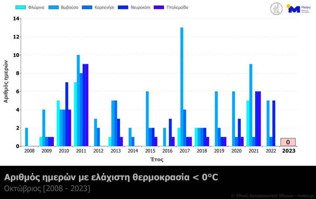 Το επόμενο γράφημα δείχνει τον αριθμό των ημερών με αρνητικές τιμές θερμοκρασίας τον μήνα Οκτώβριο ενδεικτικά για 5 περιοχές της Μακεδονίας και της Ηπείρου από το 2008 έως σήμερα.