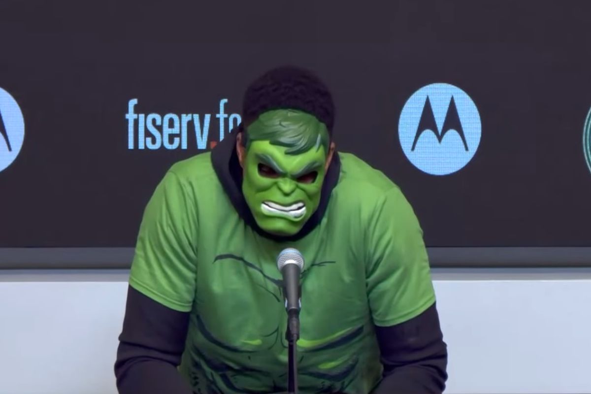 Ο πράσινος ήρωας της Marvel έδωσε έμπνευση στον παίκτη και έφερε και γούρι, αφού οι Μπακς νίκησαν τους Χιτ με 122-114. Και έτσι ο Γιάννης εμφανίστηκε και στη συνέντευξη Τύπου ντυμένος ως Hulk. «Τι έχουμε εδώ, μη φοβάστες, μιλήστε» είπε αστειευόμενος. Όταν μάλιστα οι δημοσιογράφοι ξεκίνησαν τις ερωτήσεις αναρωτήθηκε με ποια φωνή να μιλήσει, τη δική του ή του σούπερ ήρωα!
