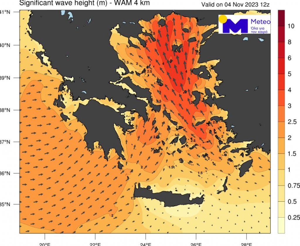 - Υψηλός κυματισμός με σημαντικό ύψος κύματος άνω των 4 μέτρων το Σάββατο 04/11 στο Βόρειο Αιγαίο, λόγω των θυελλωδών νοτίων ανέμων, όπως φαίνεται στον προγνωστικό χάρτη που ακολουθεί.