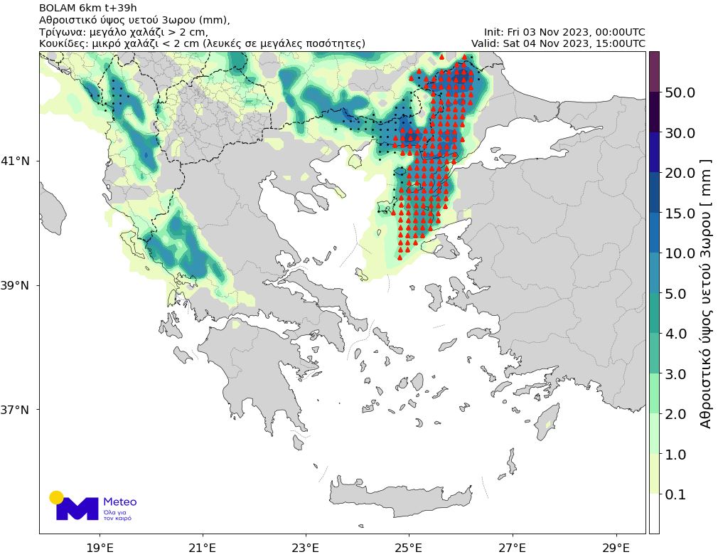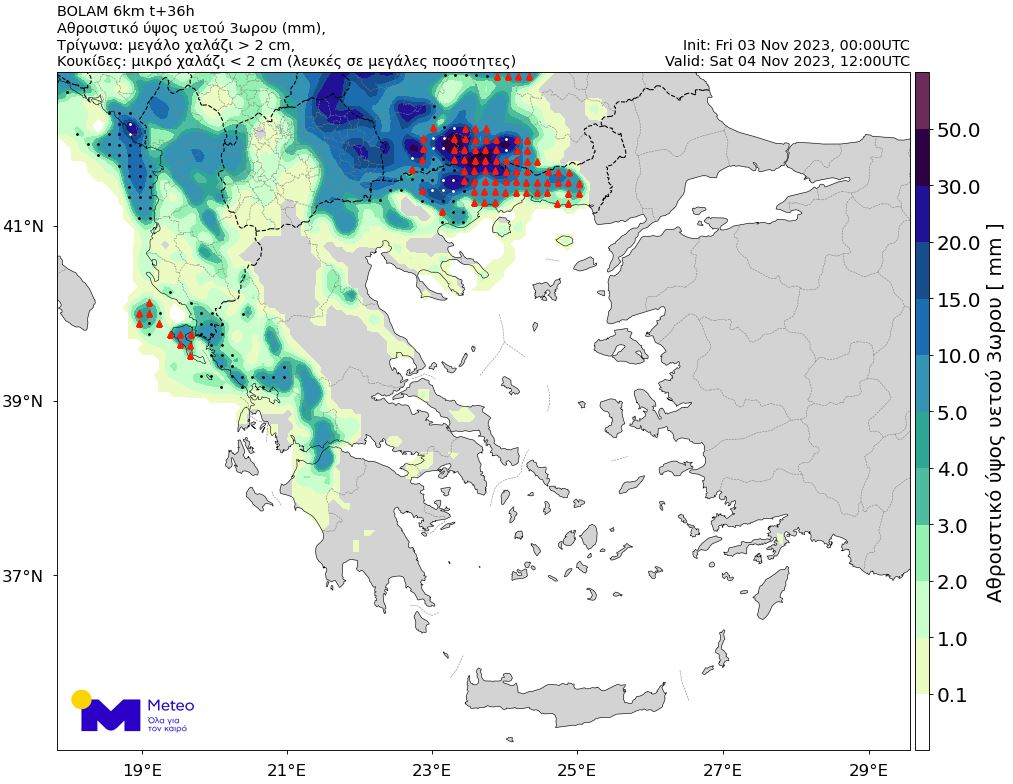 - Χαλαζοπτώσεις με πιθανότητα για χαλάζι σχετικά μεγάλου μεγέθους: Τις βραδινές ώρες της Παρασκευής 03/11 στα Βόρεια Επτάνησα και την Ήπειρο και το Σάββατο 04/11 σε περιοχές της Δυτικής και Βόρειας Ελλάδας, και σε νησιωτικά τμήματα του Βορειοανατολικού Αιγαίου. Στους προγνωστικούς χάρτες που ακολουθούν παρουσιάζεται η γεωγραφική κατανομή των φαινομένων κατά τα τρίωρα 05:00-08:00, 11:00-14:00 και 14:00-17:00 του Σαββάτου 04/11.