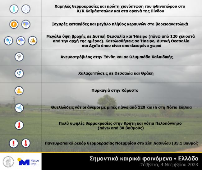 Πλήθος καιρικών φαινομένων με σημαντική γεωγραφική διασπορά καταγράφηκαν στη χώρα μας το Σάββατο (4/11) λόγω της διέλευσης του ψυχρού μετώπου.
