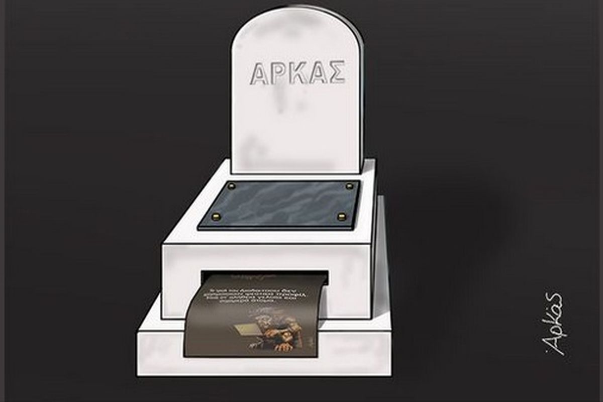 Στο νέο του σκίτσο υπάρχει ένας τάφος και η πλάκα γράφει πάνω το όνομα του Αρκά. Μάλιστα ο τάφος έχει και εκτυπωτή που αναπαράγει, τι άλλο, ένα από τα προηγούμενα σκίτσα του.