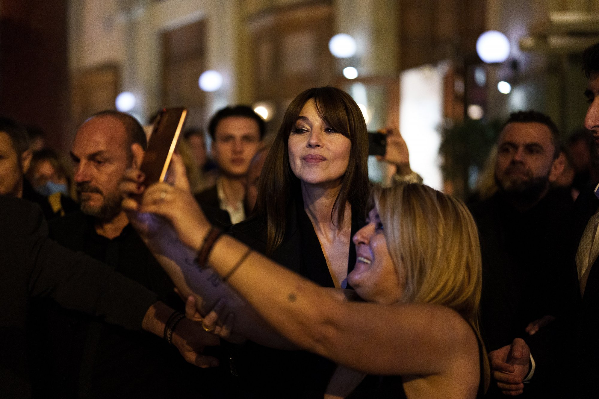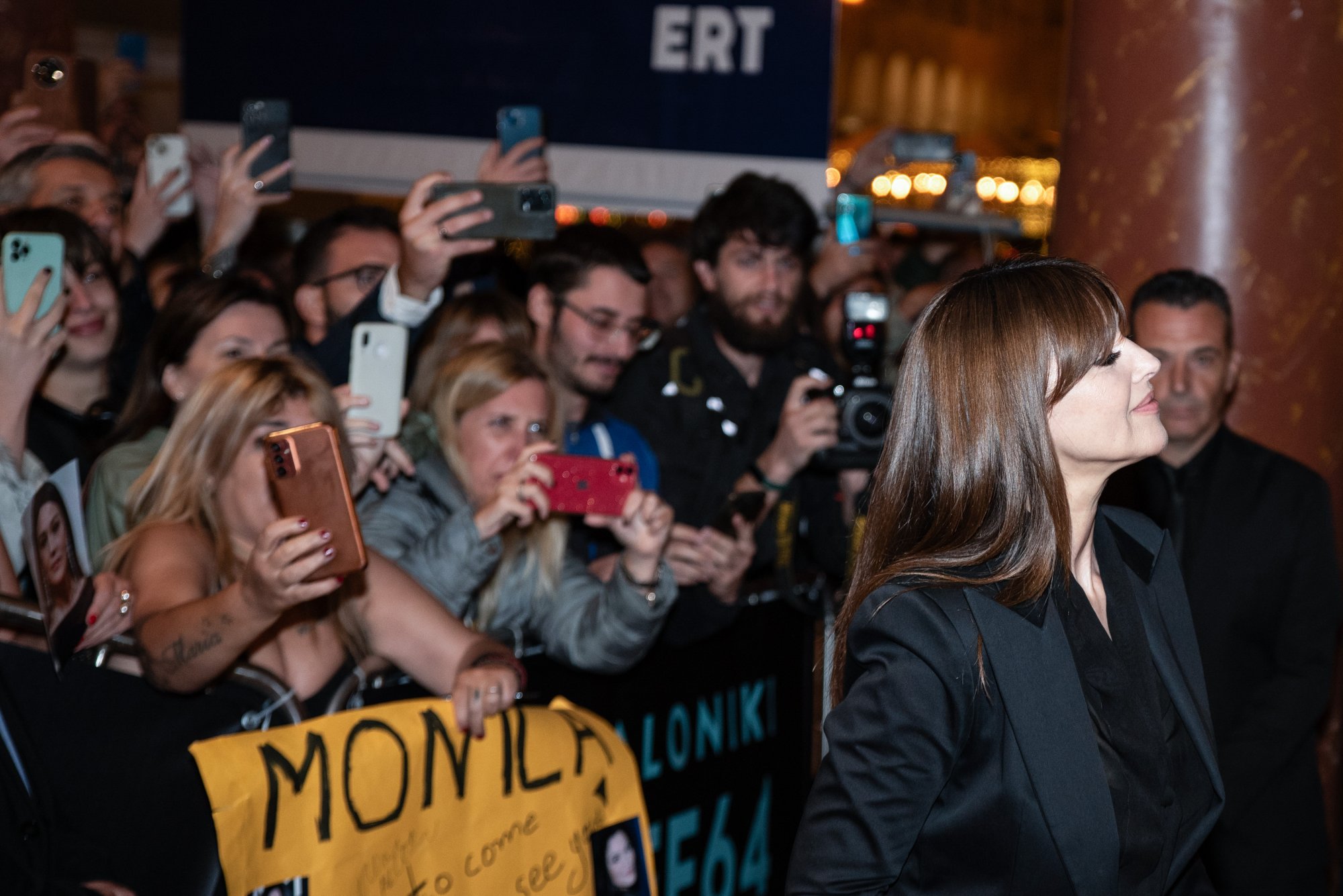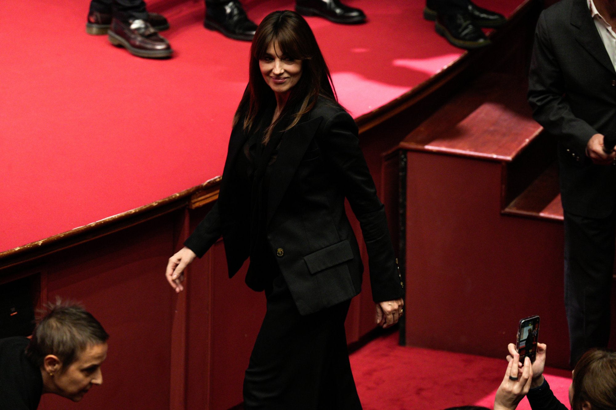 Εν μέσω επιφωνημάτων, φλας και εκφράσεων λατρείας, η Μόνικα Μπελούτσι περπατά, χαιρετά ευγενικά τον κόσμο και στέλνει ένα φιλί στον αέρα.
