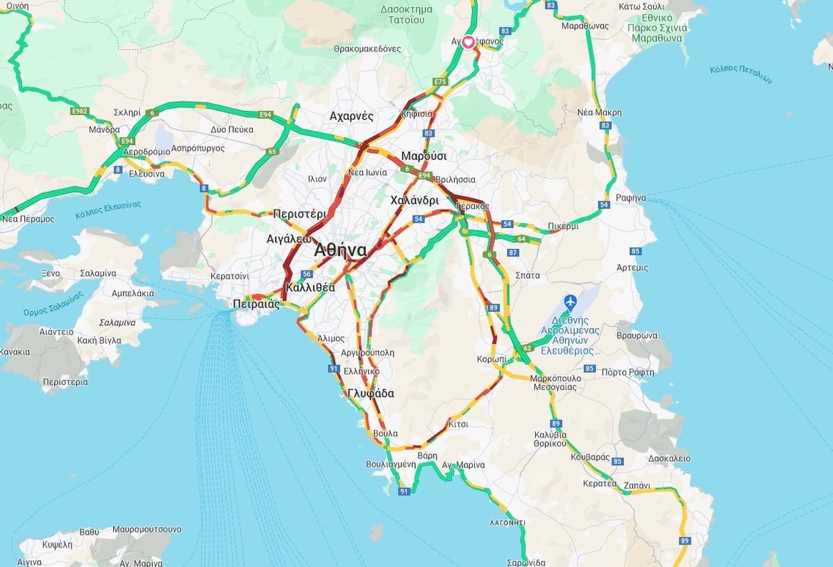 Οι περισσότερες κεντρικές οδικές αρτηρίες είναι στο κόκκινο με την κίνηση να είναι αυξημένη σε Κηφισό, Λεωφόρο Αθηνών, Κωνσταντινουπόλεως, Ιερά Οδό, Θηβών, Μεσογείων, Κηφισίας, Πειραιά.