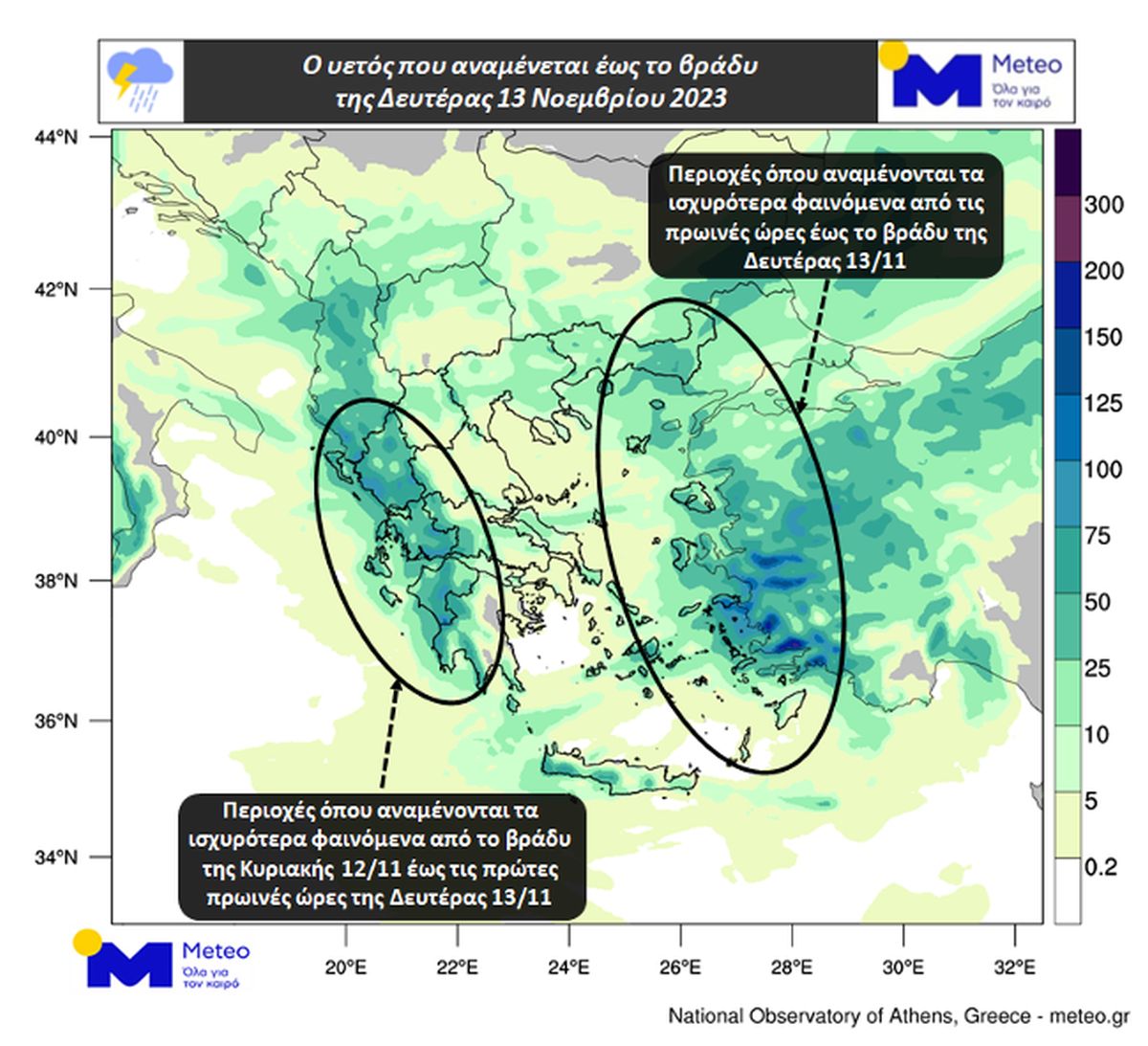 Σύμφωνα με το meteo οι βροχές και οι καταιγίδες αναμένονται να σταματήσουν αργά τη νύχτα της Δευτέρας 13/11. Το Εθνικό Αστεροσκοπείο Αθηνών κατατάσσει τα σημερινά φαινόμενα στην κατηγορία 3 (Σημαντική).