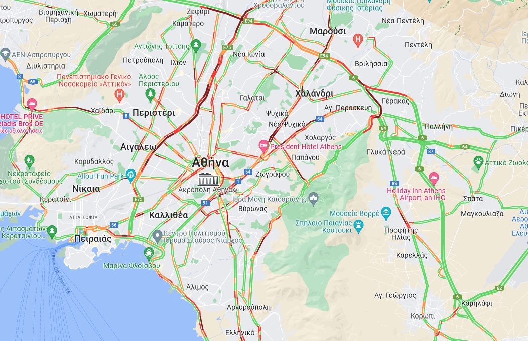 Ο χάρτης είναι κατακόκκινος σε όλες τις κεντρικές οδικές αρτηρίες. Μάλιστα, όπως ανέφερε ο κ. Λογοθέτης, όποιος θέλει να πάει από το Φαληρικό Δέλτα στα βόρεια προάστια θα πάει σημειωτόν μέχρι το Μαρούσι. «Κατακόκκινος ο χάρτης επαληθεύει την πρόβλεψη επιδείνωσης όσο πηγαίνουμε προς τα Χριστούγεννα» πρόσθεσε.