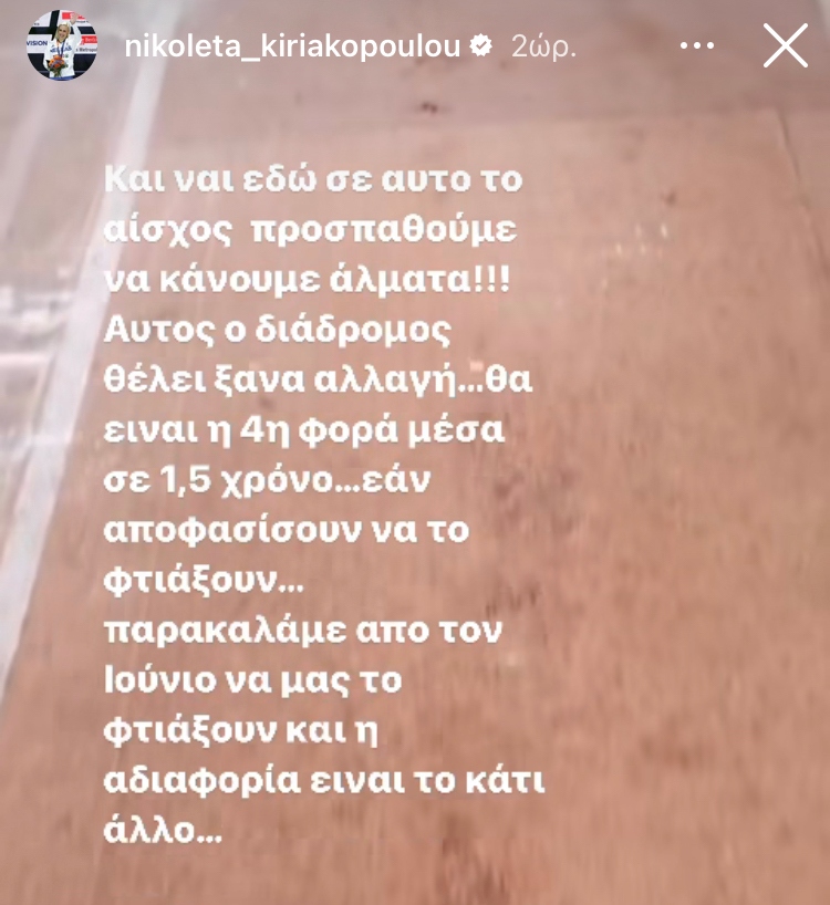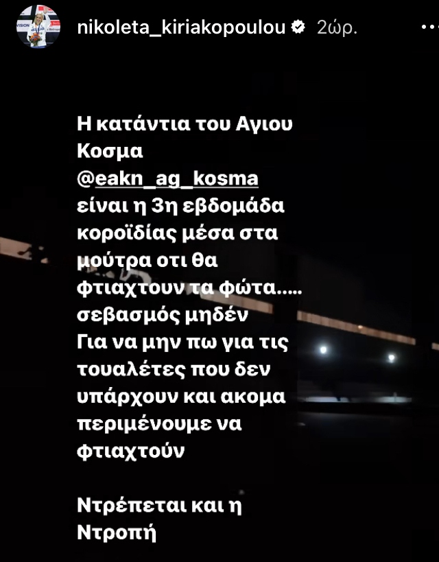 «Η κατάντια του Αγίου Κοσμά, είναι η 3η εβδομάδα κοροϊδίας μέσα στα μούτρα ότι θα φτιαχτούν τα φώτα. Σεβασμός μηδέν, για να μην πω για τις τουαλέτες που δεν υπάρχουν κι ακόμα περιμένουμε να φτιαχτούν. Ντρέπεται κι η ντροπή», έγραψε στο πρώτο από τα διαδοχικά insta-stories που ανήρτησε η Κυριακοπούλου.