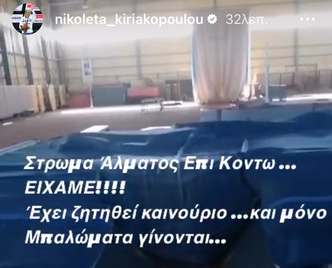 Κι ακολούθως προέβαλε με μια σειρά από reels την εικόνα των συνθηκών στις οποίες η ίδια και όλοι οι άλλοι προσπαθούν να γυμναστούν ρισκάροντας τη σωματική ακεραιότητά τους.