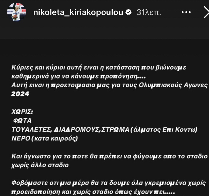 Και άγνωστο για το πότε θα πρέπει να φύγουμε από το στάδιο χωρίς άλλο στάδιο. Φοβόμαστε ότι μια μέρα θα τα δούμε όλα γκρεμισμένα, χωρίς προειδοποίηση και χωρίς στάδιο, όπως έχουν πει…», κατέληξε η τρίτη παγκόσμια πρωταθλήτρια του 2015 αποτυπώνοντας μια κατάσταση που αντί να βελτιώνεται χειροτερεύει.