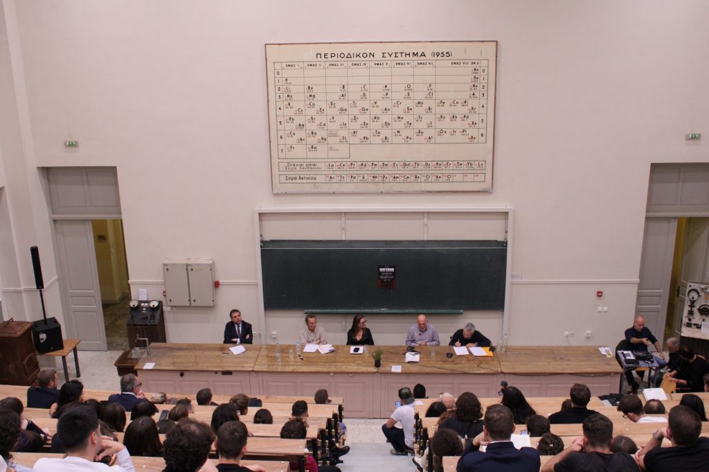 Πίσω και πάνω από τους ομιλητές ένας τεράστιος περιοδικός πίνακας με την ημερομηνία 1955 σε κάνει να συνειδητοποιείς ότι βρίσκεσαι σε μια από τις αίθουσες των τότε φοιτητών και αυτόματα σκέφτεσαι πως κοιτας τον ίδιο πίνακα που κοίταγαν οι φοιτητές του Χημικού της εποχή της Χούντας.