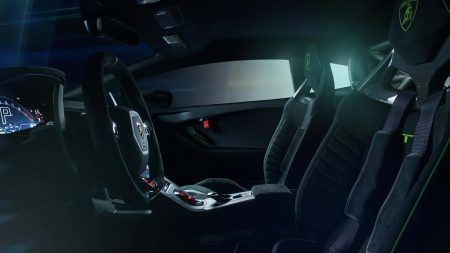 Με την ίδια ακριβώς χρωματική λογική το εσωτερικό υιοθετεί μαύρες (Nero Ade) Alcantara επενδύσεις για τα καθίσματα με πράσινες Verde Fauns ραφές. H one-off Huracan διαθέτει κλωβό ασφαλείας από αλουμίνιο, ανθρακονημάτινο κάλυμμα για το πάτωμα αλλά και ζώνες τεσσάρων σημείων. Φυσικά οι Ιταλοί δεν έχουν παραλείψει να σηματοδοτήσουν και εγγράφως την μοναδικότητα του αυτοκινήτου με μια αντίστοιχη πλακέτα από ανθρακόνημα στο εσωτερικό του αυτοκινήτου.