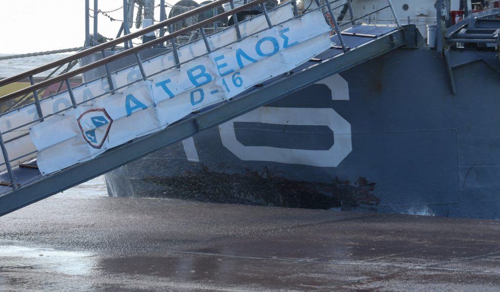 Από τους ανέμους ταχύτητας που ξεπερνά τα 90 χλμ/ώρα και εντάσεως ακόμη και 9 μποφόρ που προκάλεσαν έντονη θαλασσοταραχή στον Θερμαϊκό, το πλοίο – σύμβολο του Πολεμικού Ναυτικού προσέκρουσε στην τσιμεντένια προβλήτα με αποτέλεσμα να προκληθεί ένα ρήγμα στην πρύμνη του.