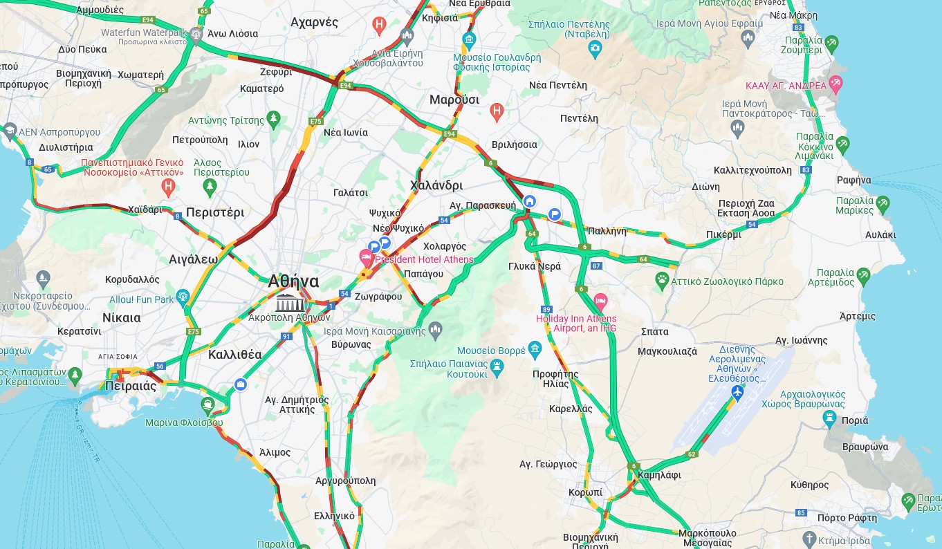 Στους υπόλοιπους δρόμους αυξημένη κίνηση στην έξοδο του Κηφισού, από Λένορμαν έως Αχαρνών, στην Κηφισίας, στη Μεσογείων και στην Παραλιακή.