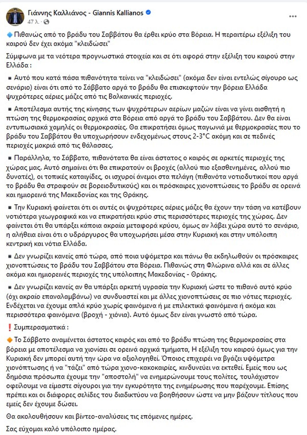 Την Κυριακή οι ψυχρότερες αέριες μάζες «θα έχουν την τάση να κατέβουν νοτιότερα γεωγραφικά και να επικρατήσει κρύο στις περισσότερες περιοχές της χώρας». Ο κ. Καλλιάνος μάλιστα σπεύδει να διεκρινίσει: «Η εξέλιξη του καιρού όμως για την Κυριακή δεν μπορεί αυτή την ώρα να αξιολογηθεί».