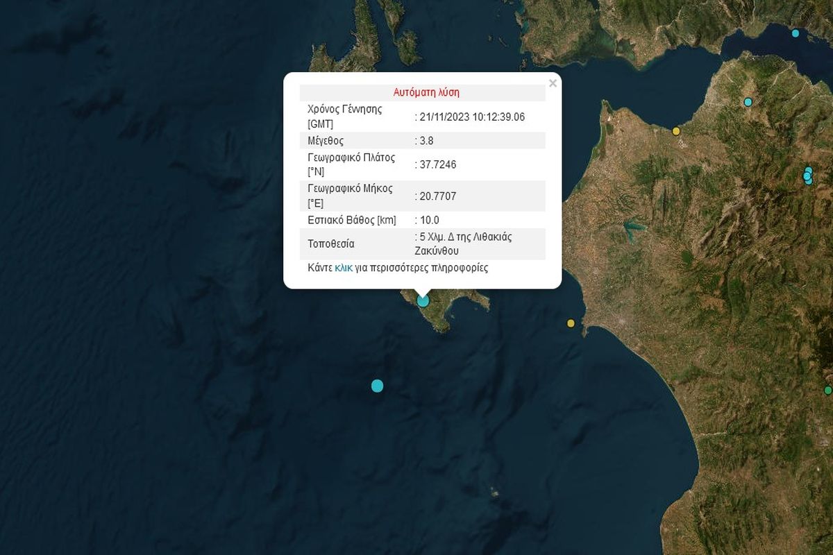 Σεισμός 3,8 Ρίχτερ καταγράφηκε νωρίτερα στη Ζάκυνθο. Σύμφωνα με το Γεωδυναμικό Ινστιτούτο ο σεισμός έγινε 5 χλμ δυτικά της Λιθακιάς και είχε εστιακό βάθος στα 10 χλμ.