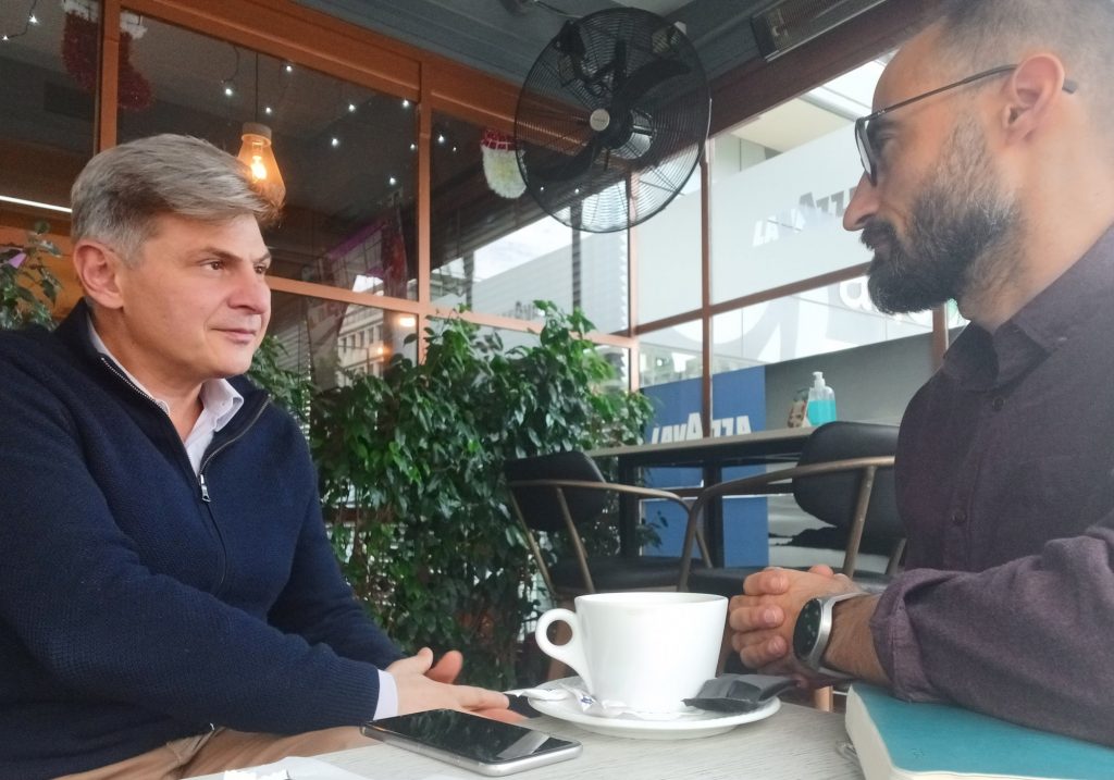 Ο αυθορμητισμός ξεχειλίζει ακόμη κι όταν παραγγέλνει ένα ζεστό τσάι «γιατί έχω ήδη πιει τρεις καφέδες» – έως τη 1 το μεσημέρι. Τόσο ευθύς και ανοικτός, συγκαταβατικός κι ανεκτικός που η συνάντησή μας είχε καθοριστεί τηλεφωνικώς μόλις μισή ώρα πριν. Εντελώς απροσδιόριστα και αυθόρμητα.