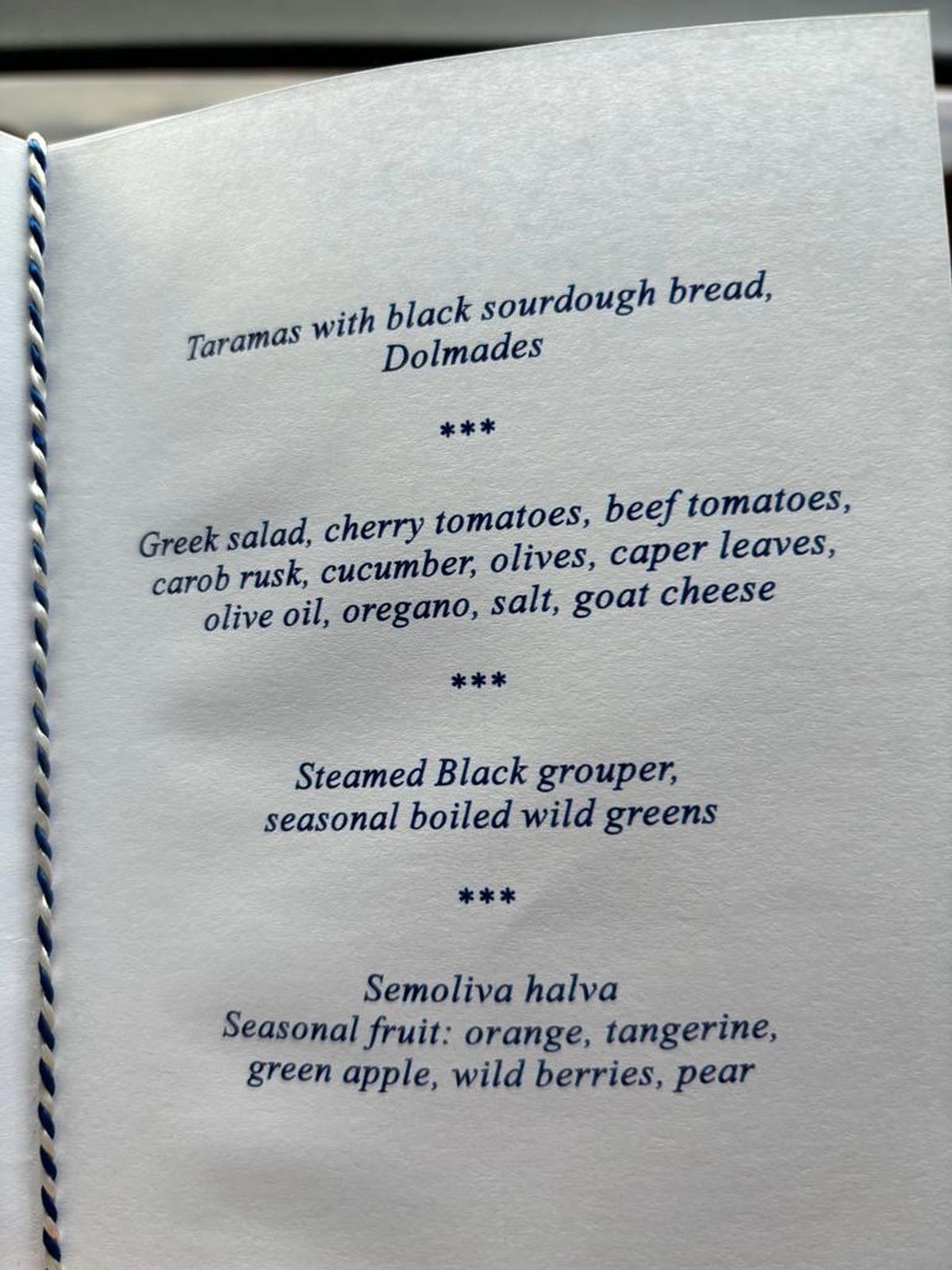 Έτσι πρώτο πιάτο είχε ελληνική σαλάτα, ντοματάκια τσέρι, ντομάτες, παξιμάδι χαρουπιού, αγγούρι ελιές, καπαρόφυλλα, ελαιόλαδο, ρίγανη αλάτι και κατσικίσιο τυρί. Κύριο πιάτο, μαύρος ροφός ψημένος στον ατμό, βραστά χόρτα εποχής και τέλος χαλβάς από σιμιγδάλι, φρούτα εποχής, πορτοκάλι, μανταρίνι, πράσινο μήλο, άγρια μούρα και αχλάδι. Γλυκό όμως δεν έφαγε ο Ερντογάν και εάν αληθεύουν αυτά που διαδίδουν οι συνεργάτες του Πρωθυπουργού, δεν πρέπει να έφαγε ούτε ο Μητσοτάκης, όχι για κανέναν ιδιαίτερο, λόγο, αλλά επειδή δεν του αρέσει.