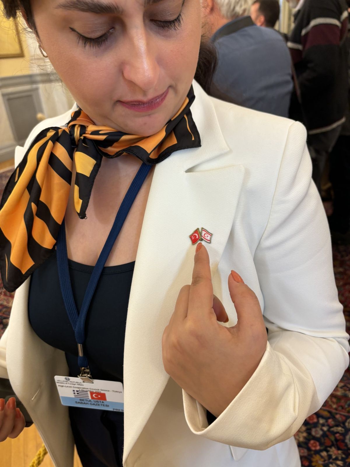 Στο Προεδρικό Μέγαρο εμφανίστηκε μια Τουρκάλα δημοσιογράφος, διπλωματική συντάκτρια της Σαμπάχ, αυτήν που συνοδεύει τον Τούρκο Πρόεδρο στα ταξίδια του με δύο σημαίες στο πέτο του λευκού σακακιού της. Η μία σημαία ήταν η τουρκική. Η άλλη όμως; Ήταν σημαία του ψευδοκράτους και η εν λόγω δημοσιογράφος την έδειχνε μάλιστα προκλητικά σε όλους.