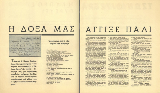 Το κλίμα στην επιτροπή άλλαξε άρδην. Διάβασα μεγαλοφώνως εκείνη την επιστολή και μου επετράπη να δημοσιεύσω στο επόμενο τεύχος μαζί με την φωτογραφία της κάρτας, το πρώτο μου κριτικό κείμενο, με τον τίτλο: «Η δόξα μας άγγιξε πάλι», όπου είχα το θράσος να επικρίνω τον ποιητή για το ότι άλλαξε τον τίτλο της τελευταίας τότε συλλογής του Κύπρον, οὖ μ’ ἐθέσπισεν σε Ημερολόγιο Καταστρώματος Γ’. Υπαινισσόμουν την εμπλοκή του διπλωμάτη τότε Σεφέρη με τον Ευάγγελο Αβέρωφ και τον Κωνσταντίνο Καραμανλή για το Κυπριακό. Την πραγματική ιστορία, την έμαθα αργότερα. Mea culpa.