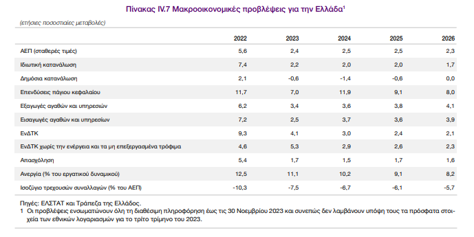 Σύμφωνα με τις τρέχουσες προβλέψεις της Τράπεζας της Ελλάδος, ο ρυθμός ανάπτυξης της ελληνικής οικονομίας το 2023 αναμένεται να διαμορφωθεί στο 2,4%, να αυξηθεί οριακά στο 2,5% το 2024 και το 2025 και να υποχωρήσει ελαφρά στο 2,3% το 2026. Συνεπώς, η ελληνική οικονομία προβλέπεται να αναπτυχθεί με ταχύτερους ρυθμούς σε σύγκριση με την ευρωζώνη.