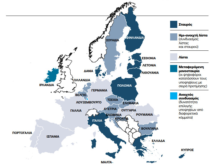Τι ισχύει όμως στα υπόλοιπα 26 κράτη – μέλη; Με ποιον τρόπο επιλέγουν οι εταίροι μας στην Ένωση τους αντιπροσώπους τους στο Ευρωπαϊκό Κοινοβούλιο; Τα συστήματα τα οποία βρίσκονται σε ισχύ αυτή τη στιγμή πανευρωπαϊκά είναι πέντε: Η κλειστή λίστα, η ανοιχτή λίστα (σταυρός προτίμησης), η ημι-ανοιχτή λίστα (συνδυασμός λίστας και σταυρού), ο ανοιχτός συνδυασμός (δυνατότητα επιλογής υποψηφίων από διαφορετικά κόμματα) και η μεταφερόμενη μονοσταυρία (οι ψηφοφόροι κατατάσσουν τους υποψηφίους με σειρά προτίμησης).