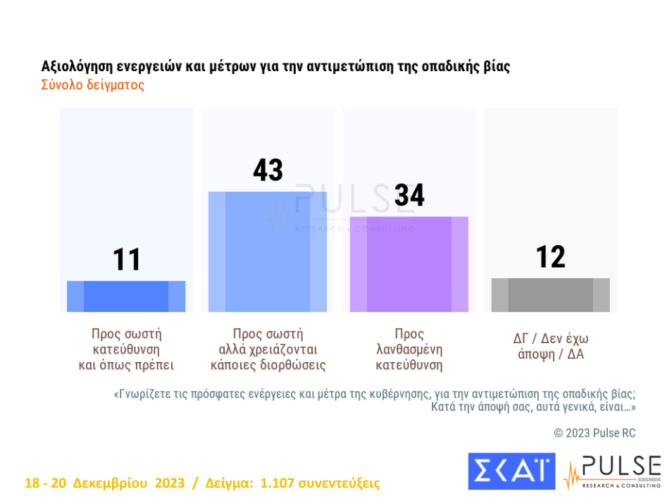 Σε σχέση με τα μέτρα που έχει λάβει η κυβέρνηση για την αντιμετώπιση της οπαδικής βίας, το 43% των ερωτηθέντων εκτιμά πως κινούνται προς την σωστή κατεύθυνση, αλλά χρειάζονται κάποιες διορθώσεις, ενώ το 34% θεωρεί πως κινούνται προς την λανθασμένη κατεύθυνση. Το 11% κρίνει πως τα μέτρα κινούνται «προς την σωστή κατεύθυνση και όπως πρέπει».