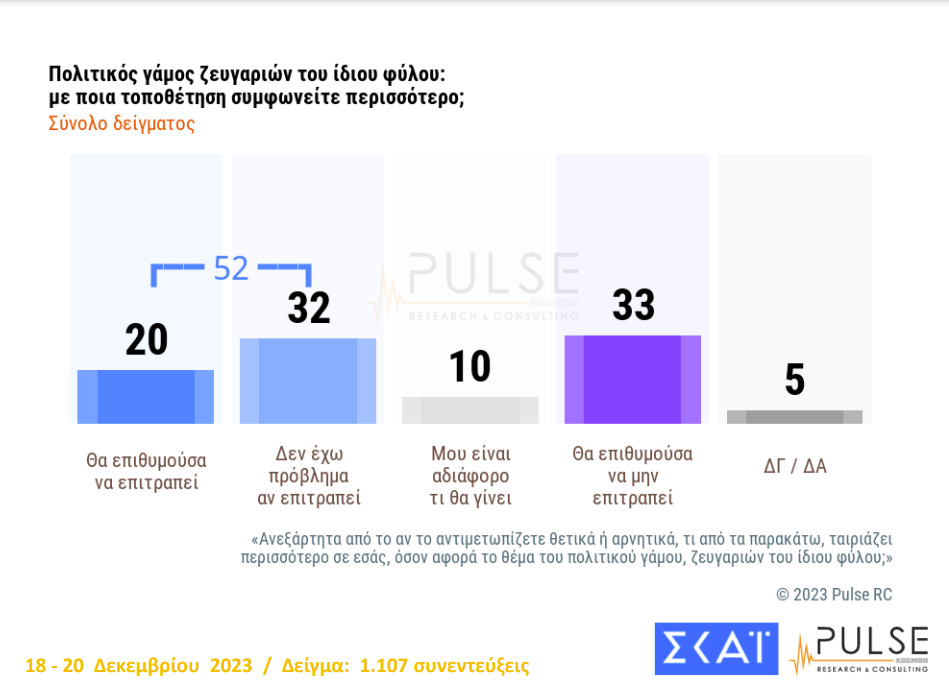 Αναφορικά με τον πολιτικό γάμο ομόφυλων ζευγαριών, το 45% αντιμετωπίζει το θέμα «σίγουρα θετικά» και «μάλλον θετικά», ενώ το 46% «μάλλον αρνητικά» και «σίγουρα αρνητικά».