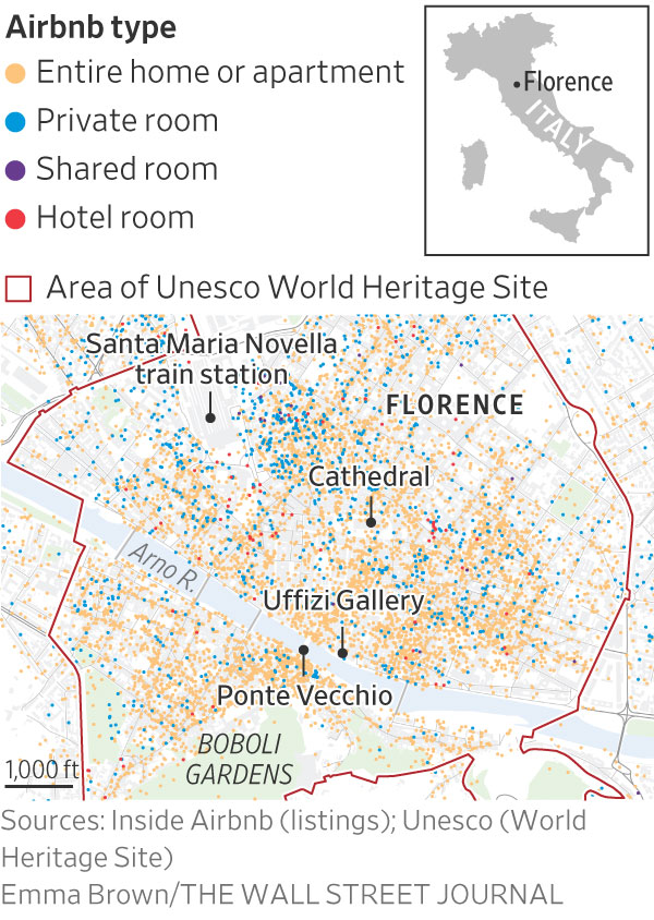 Σύμφωνα με τη μελέτη, το ιστορικό κέντρο της Φλωρεντίας –τοποθεσία εγγεγραμμένη στον κατάλογο παγκόσμιας κληρονομιάς της Unesco– έχει περισσότερες κλίνες Airbnb από ό,τι κατοίκους. «Ακόμα και αν διαθέτεις πολλά χρήματα, δεν μπορείς να βρεις σπίτι να νοικιάσεις στη Φλωρεντία, επειδή όλα τα διαμερίσματα έχουν γίνει Airbnb», λέει η Linda Sanesi, η οποία ζει έξω από το κέντρο της πόλης και διατηρεί κομμωτήριο με τον σύζυγό της σε ένα μικρό δρομάκι δίπλα στον καθεδρικό της Φλωρεντίας.