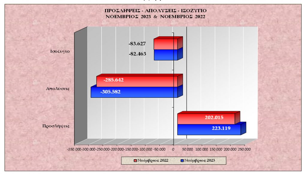 Το ισοζύγιο των ροών απασχόλησης ήταν αρνητικό τόσο τον φετινό Νοέμβριο (-82.463 θέσεις εργασίας) όσο και τον Νοέμβριο του 2022 (-83.627 θέσεις). Ωστόσο προκύπτει αυξημένη επίδοση κατά 1.164 περισσότερων θέσεων εργασίας για τον Νοέμβριο 2023.