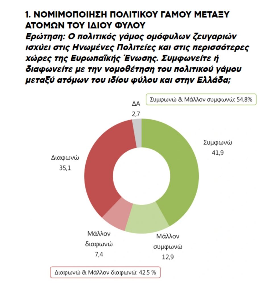 Πιο αναλυτικά το 54,8% όσων ερωτήθηκαν απάντησε καταφατικά στο αν συμφωνεί με τη νομοθέτηση του γάμου μεταξύ ατόμων του ιδίου φύλου.