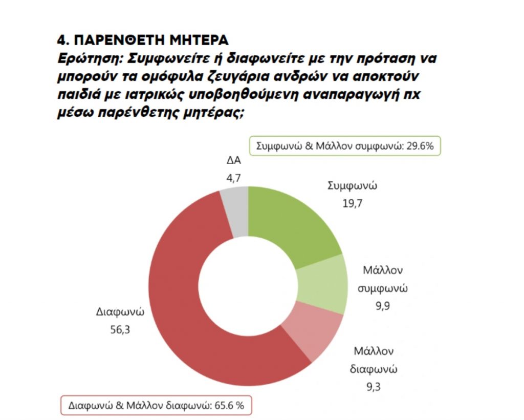 Αντιθέτως ο κόσμος εμφανίζεται να έχει αντιρρήσεις στην απόκτηση παιδιών μέσα από τη διαδικασία της παρένθετης μητέρας, κάτι που ούτως ή άλλως δεν θα προβλέπει το σχέδιο νόμου όπως θα κατατεθεί για συζήτηση και ψήφιση.