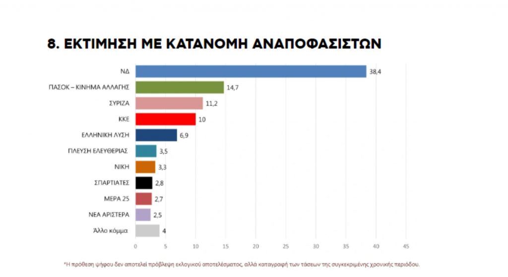 Είναι χαρακτηριστικό πως στην πρόθεση ψήφου της ίδιας έρευνας η Νέα Δημοκρατία συγκεντρώνει 34%, το οποίο εκτοξεύεται πάνω από το 38% μετά την αναγωγή των αναποφάσιστων.
