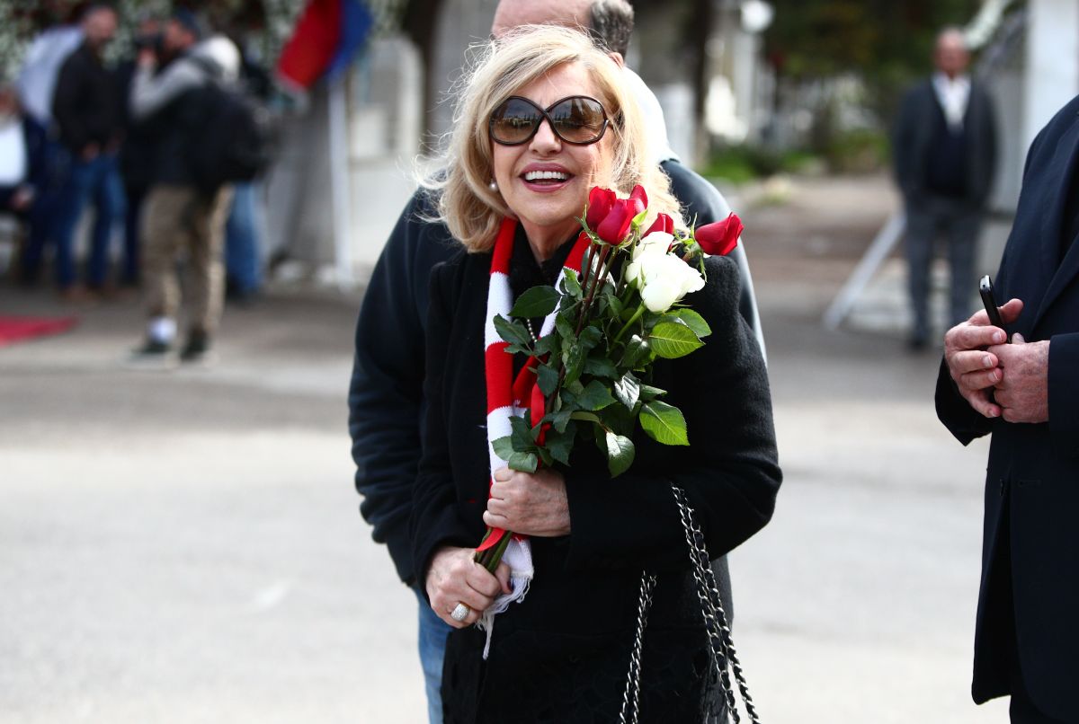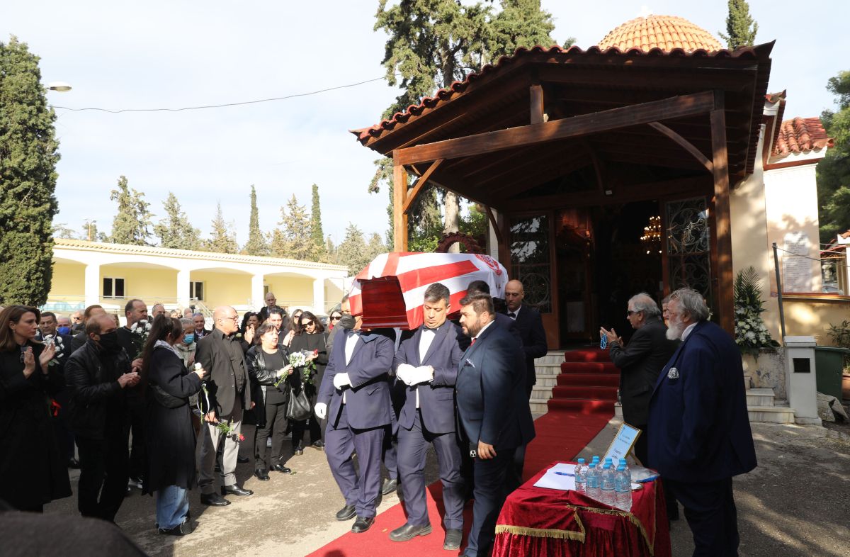 Το φέρετρο του Γιώργου Δαρίβα ήταν καλυμμένο με την ερυθρόλευκη σημαία. Ο θρυλικός παλαίμαχος επιθετικός άφησε την τελευταία του πνοή σε ηλικία 97 ετών την περασμένη Δευτέρα 15/1.