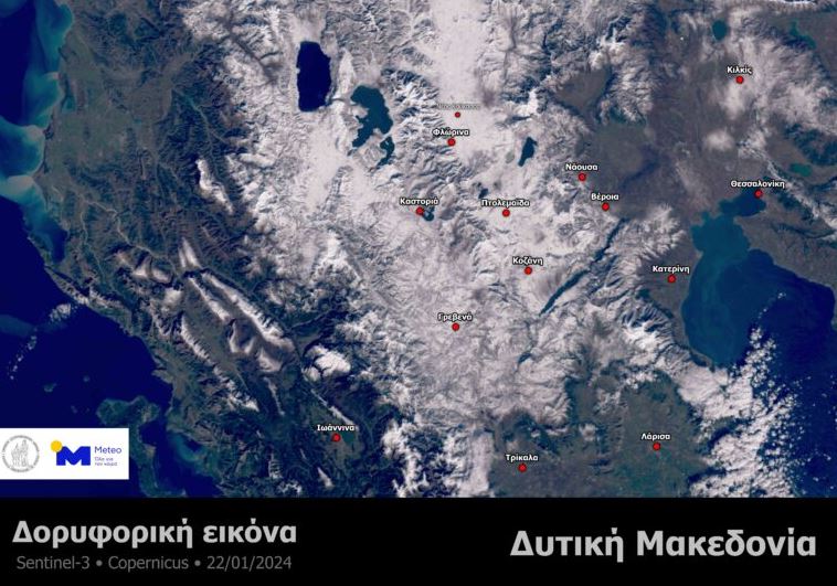 Δορυφορικά δεδομένα του ευρωπαϊκού δορυφόρου Sentinel-3 του ευρωπαϊκού προγράμματος Copernicus, που πέρασε πάνω από τη χώρα μας σήμερα το πρωί, δείχνουν σε υψηλή ανάλυση την εκτεταμένη χιονοκάλυψη στην περιοχή της δυτικής Μακεδονίας από την πρόσφατη κακοκαιρία που έπληξε κυρίως τη βόρεια Ελλάδα.