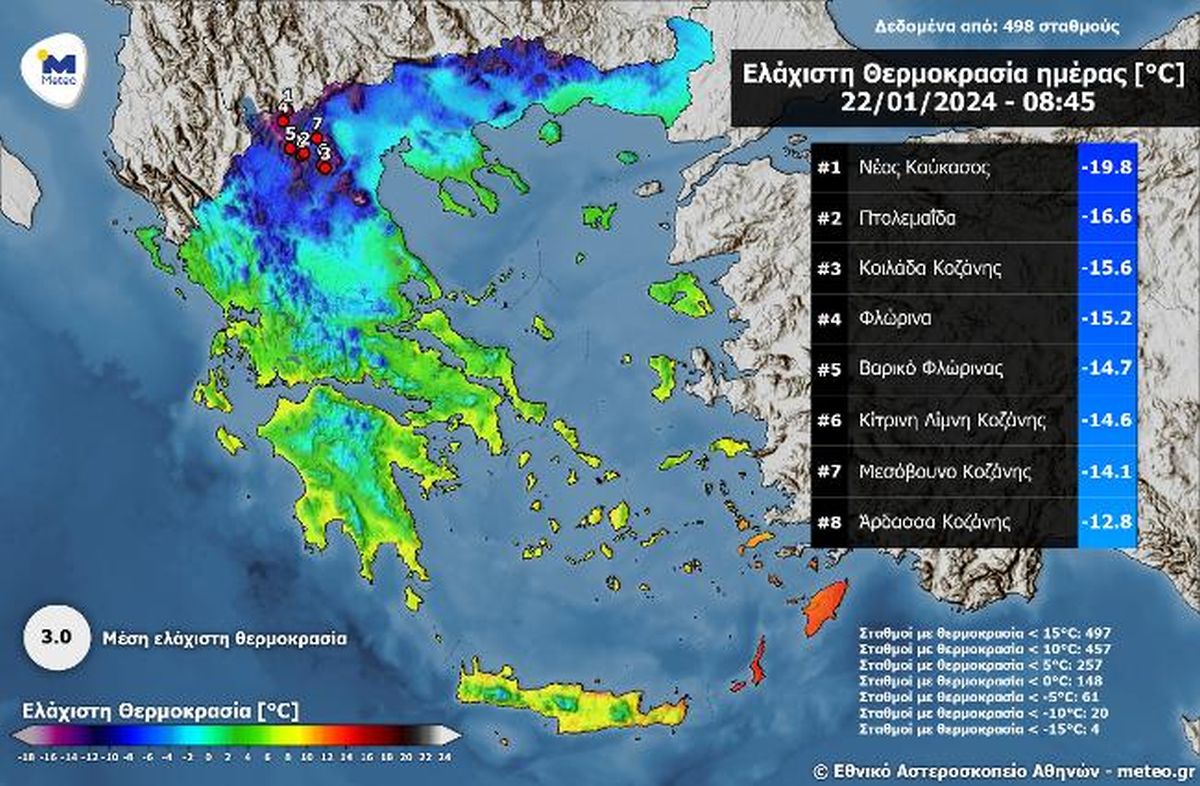 Εξαιρετικά χαμηλές είναι οι θερμοκρασίες σε περιοχές της Δυτικής Μακεδονίας όπου υπάρχει χιονοσκεπές έδαφος. Πιο συγκεκριμένα στο Νέο Καύκασο Φλωρίνης ο αυτόματος μετεωρολογικός σταθμός του δικτύου του meteo.gr στις 08:10 τοπική ώρα κατέγραψε θερμοκρασία -19.8°C, ενώ άλλες περιοχές καταγράφουν θερμοκρασίες κάτω από τους -15°C.
