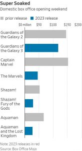 Οι λόγοι είναι πολλοί. Οι απεργίες στο Χόλιγουντ που κατέβασαν ρολά στις παραγωγές από τον Μάιο έως τα μέσα Νοεμβρίου είχαν ως αποτέλεσμα τη μετάθεση της κυκλοφορίας αρκετών μεγάλων παραγωγών στο δεύτερο μισό του 2023. Και το άλλοτε προσοδοφόρο είδος των υπερηρώων έχει αρχίσει να βυθίζεται, με την καταποντισμένη απόδοση του «Aquaman 2: Το χαμένο βασίλειο» να αποτελεί το πιο πρόσφατο παράδειγμα. Η ταινία έκανε εισπράξεις μόλις 27,7 εκατομμυρίων δολαρίων το πρώτο Σαββατοκύριακο που βγήκε στις αίθουσες, στις 22 Δεκεμβρίου – λιγότερες από τα μισές της προηγούμενης ταινίας του 2018– και έγινε η τέταρτη συνεχόμενη ταινία του franchise του DC από τη Warner Bros. Discovery που κάνει απογοητευτικό ντεμπούτο.