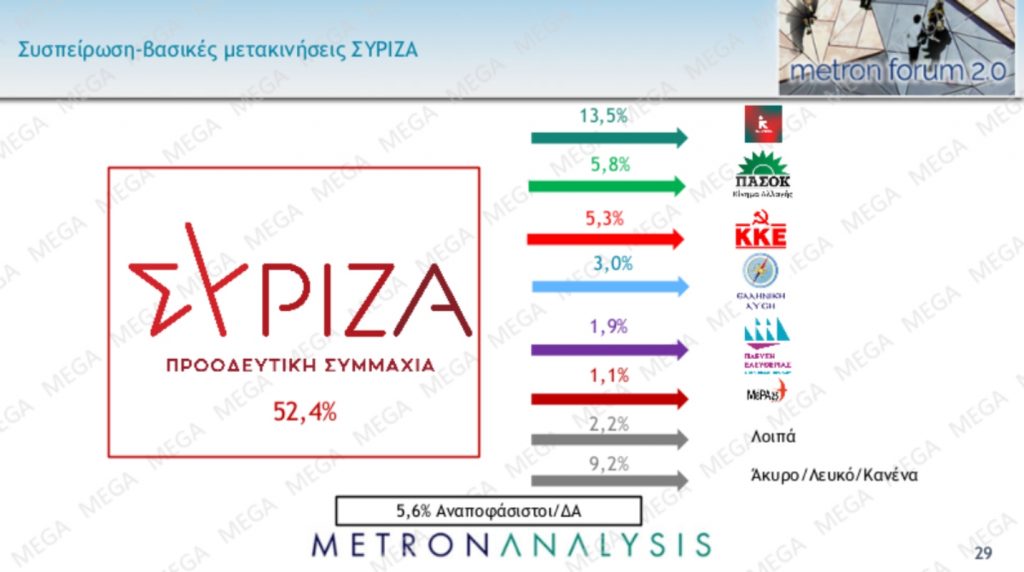 Οι αριθμοί που απεικονίζουν την, χωρίς αμφιβολία, αποτυχία του ΣΥΡΙΖΑ να κερδίσει κάτι, μικρό ή μεγάλο, από την αναπόφευκτη φθορά της ΝΔ και την αδυναμία εκτόξευσης του ΠαΣοΚ, είναι αυτοί που αφορούν τις μετακινήσεις προς αυτόν. Αφενός μεν από τη «γαλάζια δεξαμενή» αφετέρου δε από τη σοσιαλιστική πτέρυγα δεν αποκομίζει σχεδόν τίποτα, με συνέπεια να μην καταγράφεται καν στα ευρήματα κάποιο ποσοστό. Άρα δεν ανταποκρίνεται στις επιταγές του κεντρώου χώρου. Είχε ήδη αναδειχθεί προσφάτως αυτή η πτυχή.
