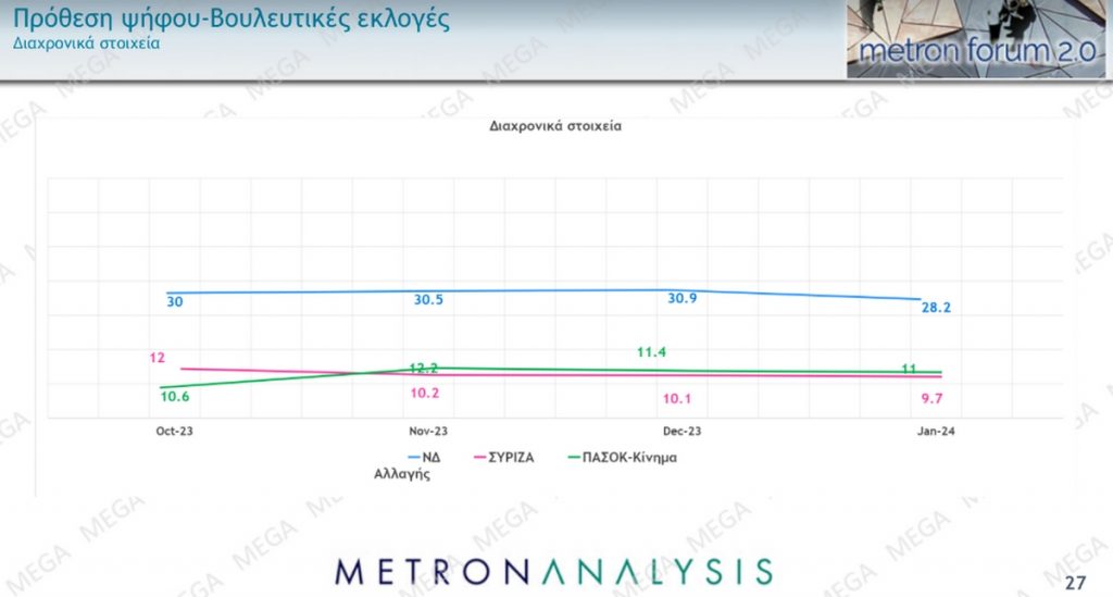 Χάνει, άλλωστε, τόσο στην πρόθεση ψήφου, πέφτοντας κάτω από τη βάση του 10% (στο 9.7% από το 10.1% και το 12% του Οκτωβρίου), όσο και στην εκτίμηση (από το 12.4% στο 12.1 με το σφάλμα στο +/-1.8).