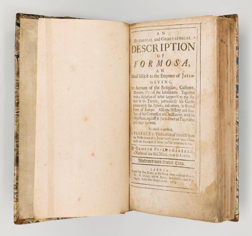 George Psalmanzar, Ιστορική και γεωγραφική περιγραφή της Φορμόζας, νήσου υποτελούς στον αυτοκράτορα της Ιαπωνίας. Περιέχει περιγραφή της θρησκείας, των εθίμων, των ηθών κτλ. των κατοίκων της, Λονδίνο, 1705. Σπίτι Ευρωπαϊκής Ιστορίας, Βέλγιο