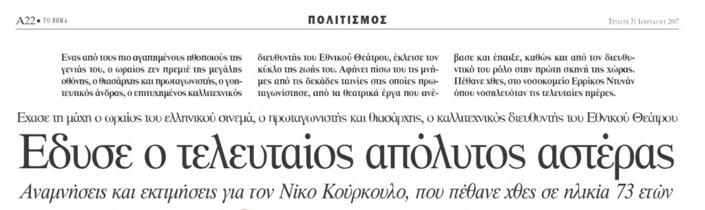 Στις 30 Ιανουαρίου 2007, φεύγει από τη ζωή ο ηθοποιός, θιασάρχης και τότε καλλιτεχνικός διευθυντής του Εθνικού Θεάτρου, Νίκος Κούρκουλος. «Ο τελευταίος απόλυτος αστέρας», όπως τον χαρακτήρισε «ΤΟ ΒΗΜΑ» την επομένη του θανάτου του.